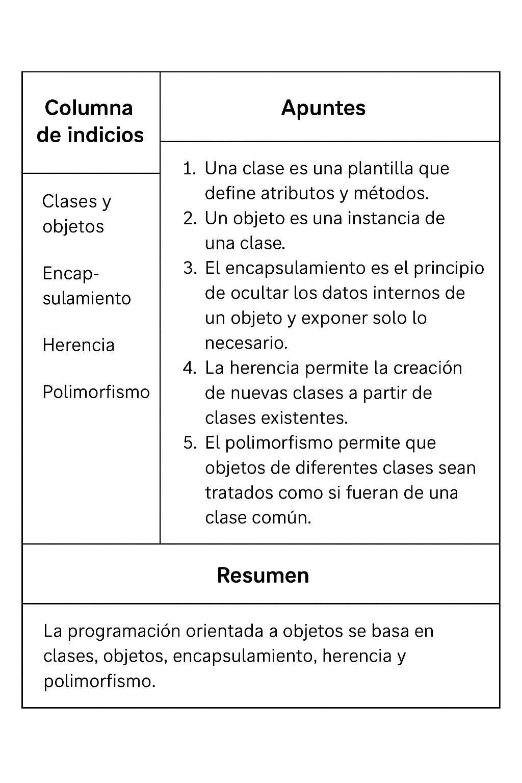 Así tomaremos los apuntes de la clase en la sección de la derecha, una vez finalizada la clase colocaremos en la columna de indicios palabras o frases que nos indiquen la idea principal de los apuntes. También se pueden poner preguntas en su lugar así se asemeja más a un examen.